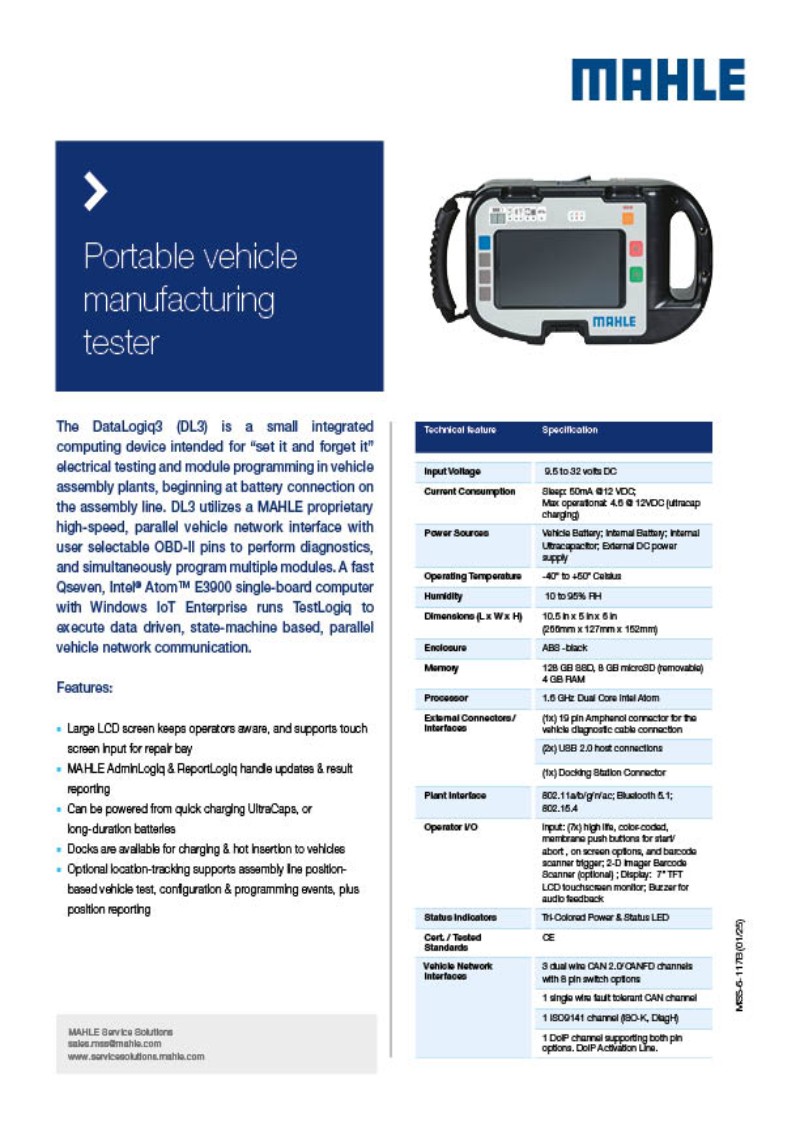 The DataLogiq3 is a small integrated computing device intended for "set it and forget it" electrical testing and module programming in vehicle assembly plants. DataLogiq3 comprises of a power efficient standard form factor Atom-based single board computer (SBC) along with MAHLE's DataWorks (DW) vehicle communications interface (VCI) and an intelligent power management board (IPMB) with location-aware intelligence.